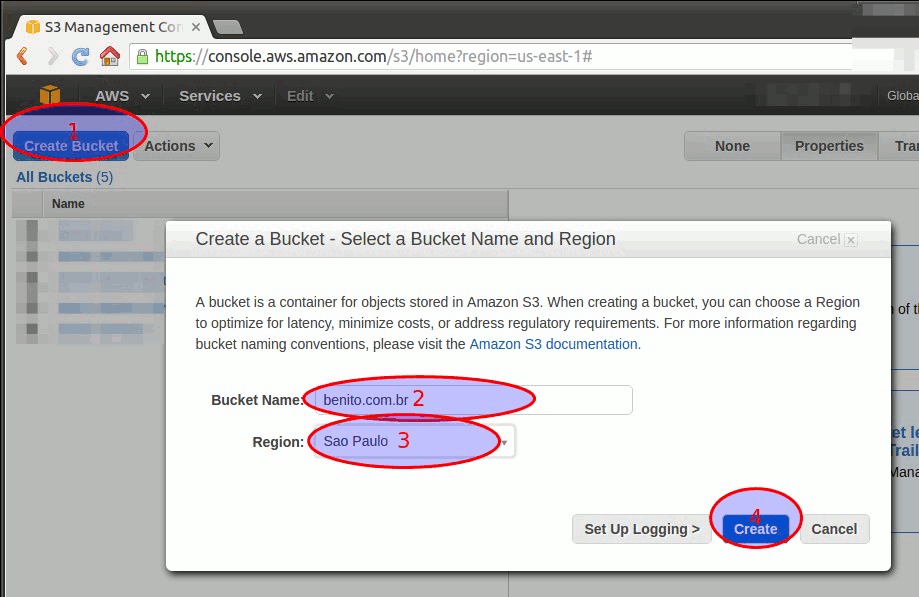 Abra o console do Amazon S3 para criar o bucket do site. Não reaproveite outro bucket pois iremos configurá-lo para servir o conteúdo através do protocolo HTTP, todo o conteúdo do bucket estará exposto na Internet. Clique no botão Create Bucket e escolha uma região para o bucket. Outro ponto importante é o nome do bucket, o domínio de nomes é compartilhado entre todos os usuários do AWS, então se eu criar um bucket chamado balde e outro usuário tentar criar um bucket com mesmo nome ele terá problemas. Para evitar esses conflitos sugiro podemos: